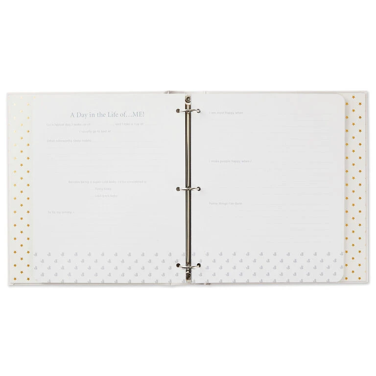- Hardcover three-ring binder baby book features gold foil lettering and design on cover.